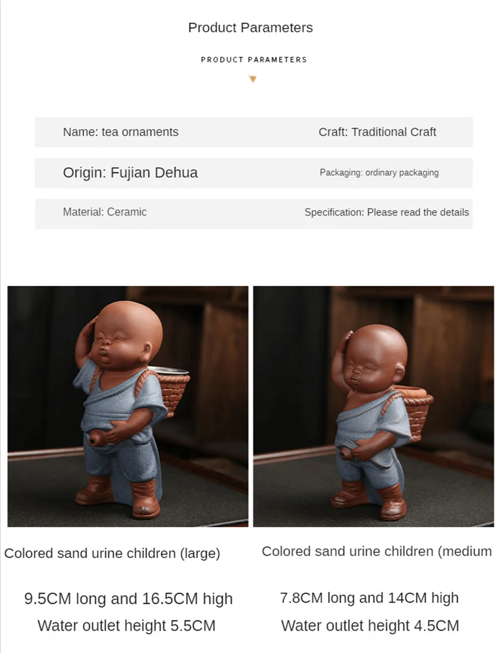 Size: colored sand urine child (middle): 9.5CM long * 16.5CM high * outlet height 5.5CM; Colored sand urine child (middle): 7.8CM long * 14CM high * outlet height 4.5CM; Colored sand urine child (small) is 7CM long * 9.5CM high * outlet height 2.7CM;