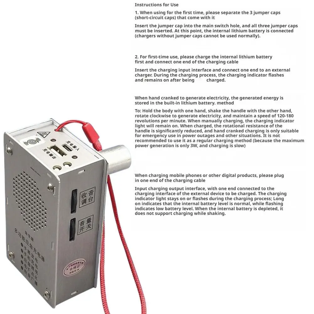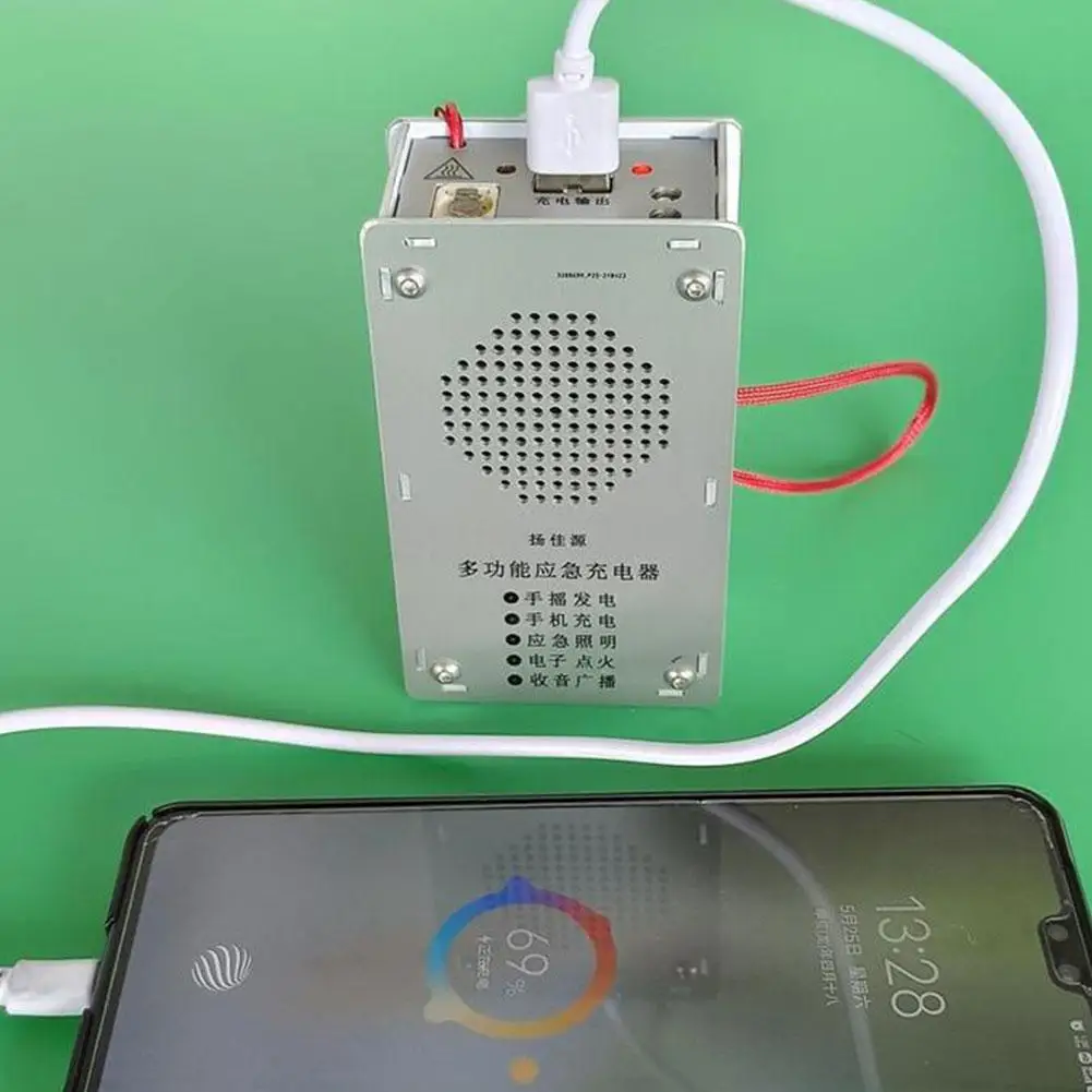 This multi-functional emergency charger is only suitable for emergency charging or for fun and stress relief occasions, and cannot replace regular power banks or chargers. Because its power generation capacity is small (up to 3 watts), the battery capacity is small (3.7V 1000mah), and the USB output is slow charging (5V1A). Please be informed