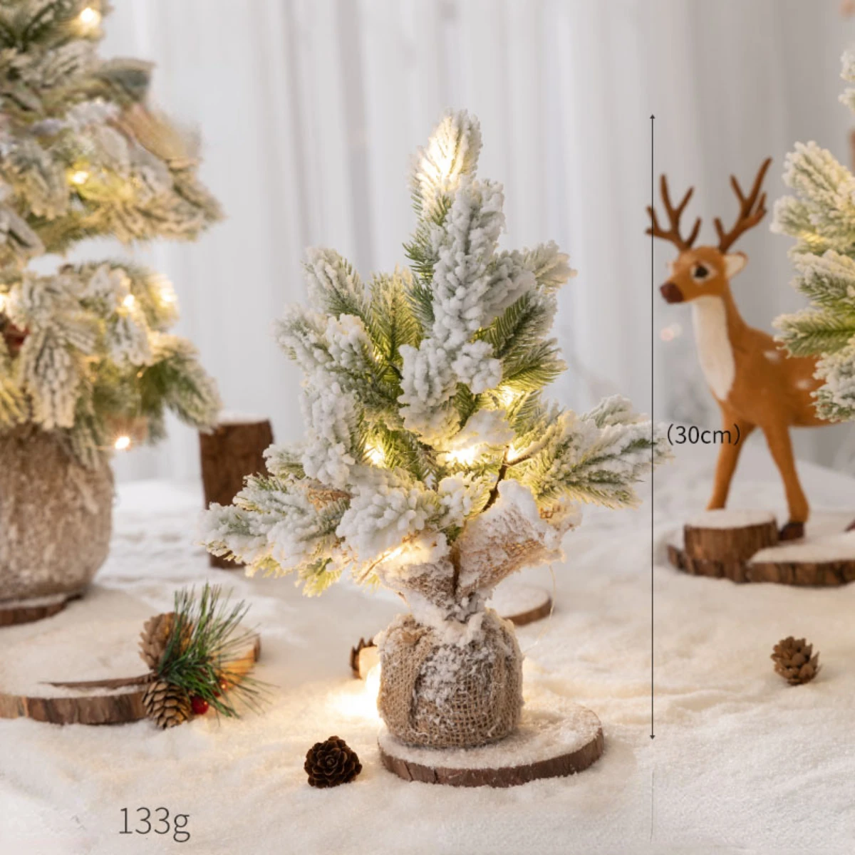 Pre-Lit Artificial Mini Christmas Tree, Snow Flocked PE Pine Xmas Tree with 30 LED Lights,Desktop Christmas Tree Burlap Base